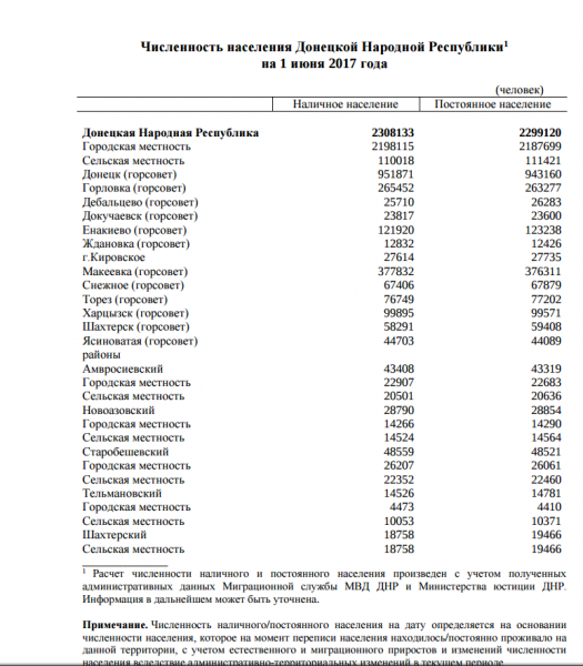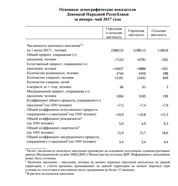 "Сайт управления статистики ДНР опубликовал демографическую статистику на территории, подконтрольной Захарченко. Возможности проверить достоверность этой информации нет. Скорее всего, она приукрашена. Но даже если это и так, цифры все равно не утешительны для Донбасса.