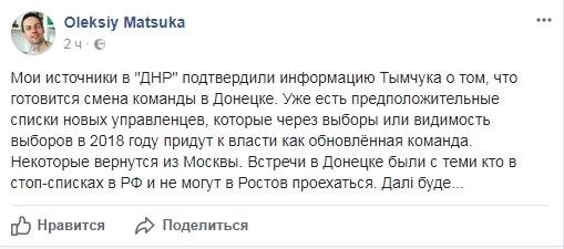 Информацию Дмитрия Тымчука о смене руководства "ДНР" также подтвердил журналист Алексей Мацука. Ссылаясь на собственные источники, он заявил, что уже есть предположительные списки новых управленцев, которые придут к власти, как обновлённая команда. Правда, по его словам, произойдет это "через выборы или видимость выборов" в 2018 году.