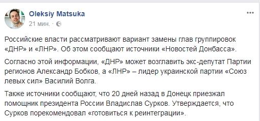 Позже, Мацука, ссылаясь на источники "Новостей Донбасса" опубликовал в Фейсбуке пост с именами тех, кто может сменить Захарченко и Плотницкого. "ДНР" может возглавить экс-депутат Партии регионов Александр Бобков, а «ЛНР» – лидер украинской партии «Союз левых сил» Василий Волга.