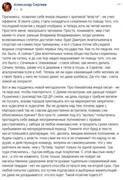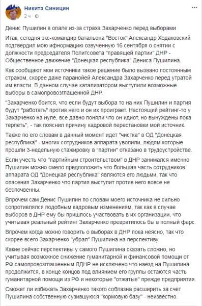 "Захарченко боится, что если будут выборы, то на них Пушилин и партия будут "работать" против него, и он их проиграет. Настоящий рейтинг-то у Захарченко на нуле, все давно поняли, что он идиот, но вынуждены пока терпеть", — написал журналист, ссылаясь на источник.
