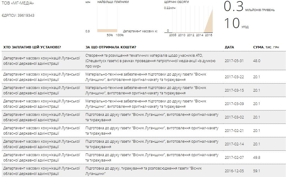 Финансово талантливый журналист на этом не останавливается и берет на себя еще одно обязательство: подготовку к печати газеты «Вестник Луганщины» и тиражирование – и через два для после заключения договора, 25 ноября 2016 года его предприятие ООО «МГ-МЕДИА» получает от Департамента массовых коммуникаций ЛОГА 55 440 грн.