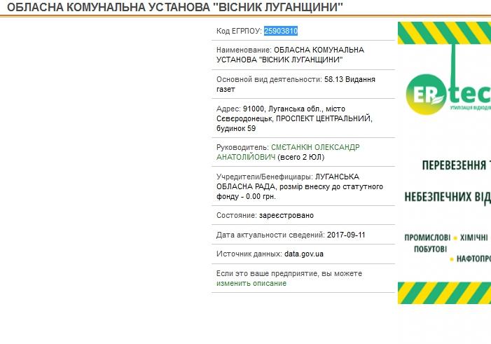 Самое интересное то, что Коммунальное учреждение «Вестник Луганщины» не имеет никакого отношения к газете «Вестник Луганщины», потому что выпускает «Вести Луганщины» под названием «Луганщина.UA». Неплохой узел получается, учитывая то, что в обоих случаях «сливки снимает» один человек – Александр Сметанкин, главный редактор «Луганщина.UA» («Вести Луганщины»).