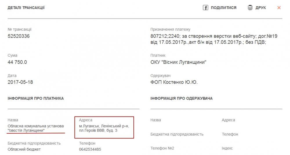 С этого момента пошли регулярные платежи за разные услуги (за материально-техническое обеспечение, изготовление оригинал-макета и тираж), в том числе за спецвыпуски. Последний платеж 48 тыс. грн. был 8 июня 2017 года за изготовление Спецвыпуска с размещением материалов по участникам АТО. Всего за период выпуска «Вестей Луганщины» было получено около 330 тыс. грн.