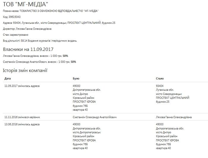 Наверное, чтобы исправить эту ситуацию, ООО «МГ-МЕДИА» 11.09.2017 г. меняет прописку на северодонецкую, и на 11.09.2017 г. Сметанкин владел уже половиной уставного фонда фирмы. А на данный момент он уже не является учредителем, отдав все руководителю ООО, которого назначили еще в прошлом году – Анне Ляховой.