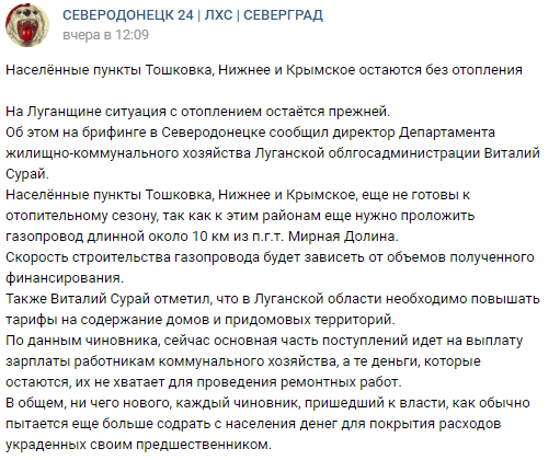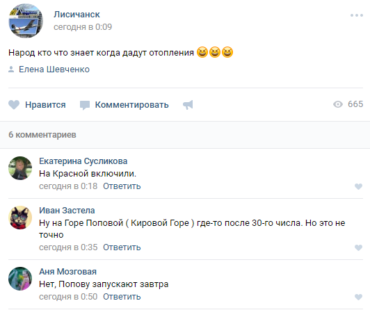 Лисичанск также понемногу «теплеет»: как стало известно вчера, НАК «Нафтогаз» дал устное «добро» открыть вентили «Лисичансктеплосети». Правда, никаких договоров еще подписано не было, однако уже вечером 24 октября жители некоторых районов Лисичанска начали сообщать в соцсетях, что тепло в их квартиры, наконец, пришло.