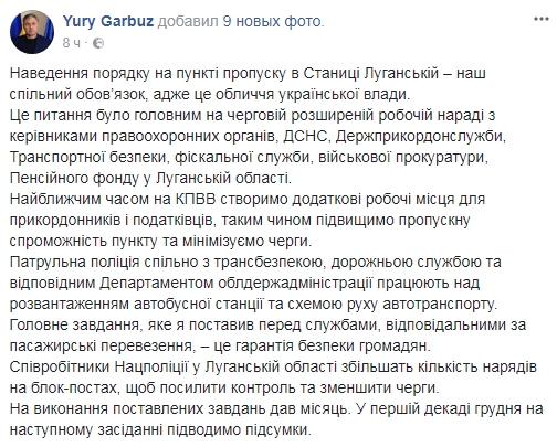 В свою очередь, руководитель Луганской областной ВГА Юрий Гарбуз, который в четверг, 9 ноября, побывал на пункте пропуска в Станице Луганской, сообщил в Фейсбуке, что почти час простоял в очереди.