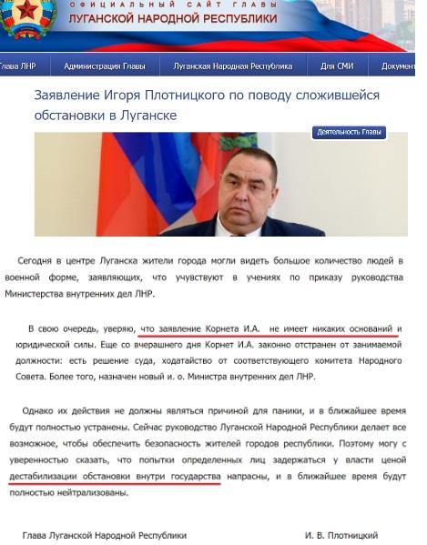 «В свою очередь, уверяю, что заявление Корнета И.А. не имеет никаких оснований и юридической силы», - отметил Плотницкий.