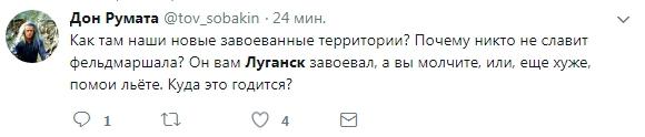 Другой пользователь сети спрашивает: «Почему никто не славит фельдмаршала? Он вам Луганск завоевал, а вы молчите».