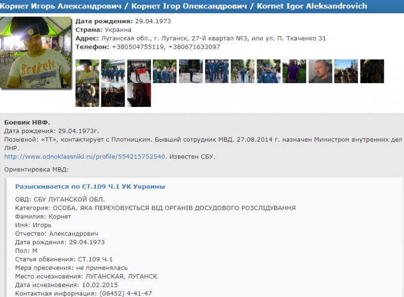 В феврале 2015 года Служба безопасности Украины объявила Корнета в розыск за создание террористической группировки, посягательство на территориальную целостность страны и преступные действия с целью свержения конституционного строя.