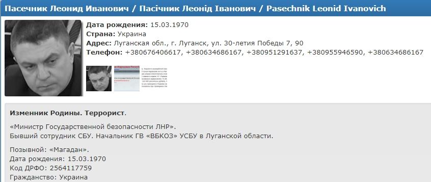 В марте 2015 года имя Пасечника (позывной «Магадан») занесено в раздел «Чистилище» базы преступников «Миротворца». Экс-сотрудник СБУ, который после начала вооруженного конфликта на Донбассе стал «министром государственной безопасности ЛНР», числится как террорист и изменник Родины. Данные о семейном положении и детях пока неизвестны.