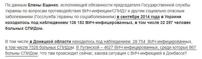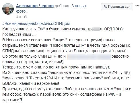 В частности, Чернов сообщил, что в город Новоазовск приехали инфекционисты из Донецка и провели «прием». Из 25-ти человек, которые прошли анонимные тесты на ВИЧ, у трех - «подозрение». Источники сообщают, что это не бомжи и не наркоманы.