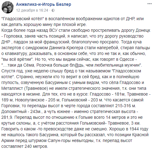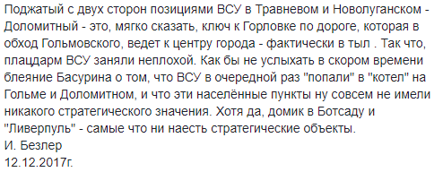 Тем временем сам Безлер раскритиковал заявления Басурина о том, что позиции ВСУ в Гладосово невыгодны и грозят «котлом». Террорист сообщил, на каких высотах находятся новые позиции сил АТО и тем самым опроверг слова Басурина о том, что они находятся в «невыгодной» низине. По словам Безлера, поселок Доломитный, поджатый ВСУ с двух сторон, является «ключом» к Горловке.