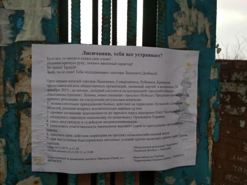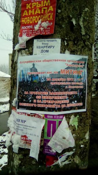 В Лисичанске Луганской области на деревьях и столбах расклеены объявления с призывами прийти на митинг «за принятие законопроекта об импичменте и за прекращение военного конфликта на Донбассе». Инициаторами акции, запланированной на 24 декабря, выступает общественная организация, которая называет себя «Характерник».