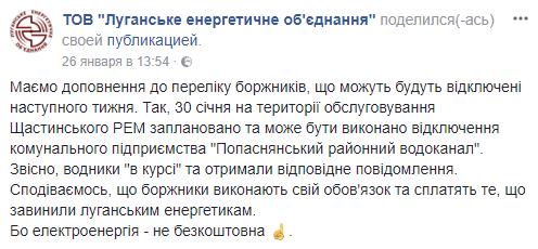 Воду в Луганск подавал Попаснянский водоканал. У предприятия накопились долги за электричество перед Луганским энергетическим объединением, и ЛЭО после многократных предупреждений все же его обесточило. Об этом энергетики предупреждали еще 26 января.