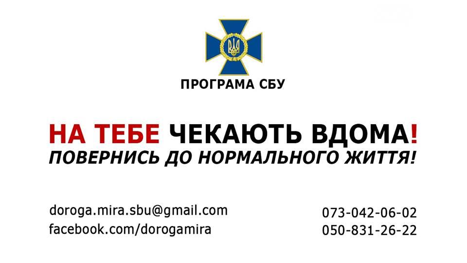 СБУ в рамках специальной программы «Тебя ждут дома» осуществляет меры по возвращению на подконтрольную Украины территорию и освобождение от уголовной ответственности граждан, которые добровольно отказались от участия в незаконных вооруженных формированиях российско-оккупационных войск.