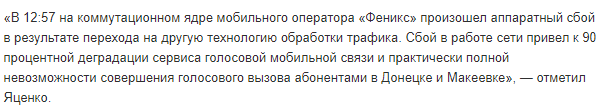 По словам местного «министра связи» Виктора Яценко, сбой на коммутационном ядре произошел в 12 часов 57 минут. Причиной аварии стала смена технологии обработки трафика. В итоге голосовую связь настигла 90-процентная деградация, и жители Макеевки и Донецка практически не могут никому дозвониться.