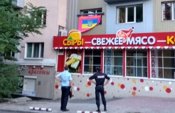 На снимках видно, как флаг Украины развевался на крыше дома. Кроме того, на фасаде здания на Комсомольском проспекте кто-то повесил сине-желтый флаг с трезубцем и надписью "Донецк - это Украина".