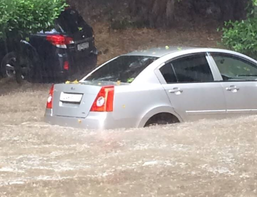 В Симферополе после очередного ливня центральные улицы превратились в реки, вода поднялась выше бордюров. Ураган повалил деревья, движение транспорта в некоторых районах города парализовано: