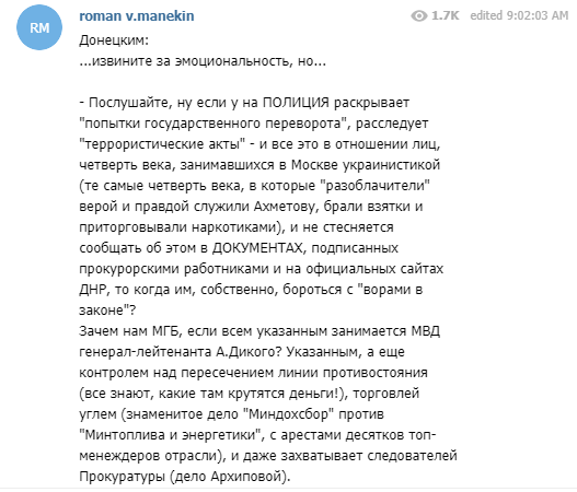 Манекин раскритиковал "правоохранительные органы" и весь "государственный строй" террористической "республики", упомянув несколько наглядных фактов.