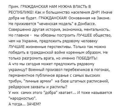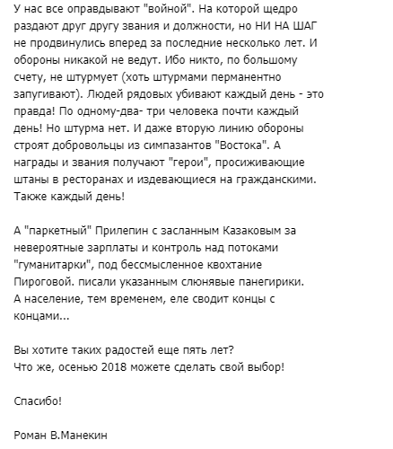 Манекин пишет, что весь беспредел в "ДНР" оправдывают войной. При этом пропагандист сетует, что "армия" боевиков за последние годы ни на шаг не продвинулась вперед и не ведет никакой обороны. В то же время рядовые "вояки" продолжают гибнуть каждый день, а "награды" получают те, кто просиживает штаны в ресторанах и издевается над гражданскими.