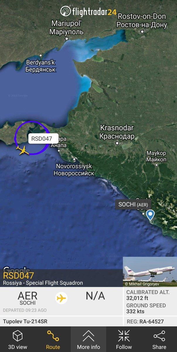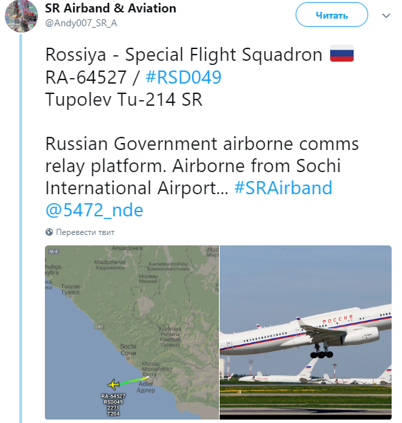 Интересно, что в этот момент можно было наблюдать еще один российский самолет спецназначения Ту-214СУС, регистрация RA-64524, позывной RSD117. Последний, также вылетевший из Сочи, считается воздушно-транспортным центром связи, оснащен коммуникационными и специальными техническими средствами для связи в любой точке мира по маршруту и предназначен для перевозки главы государства, а также правительственных делегаций. Обычно Ту-214СР сопросождает самолет с президентом, обеспечивая связь с другими самолетами, наземными приемниками и спутниками.