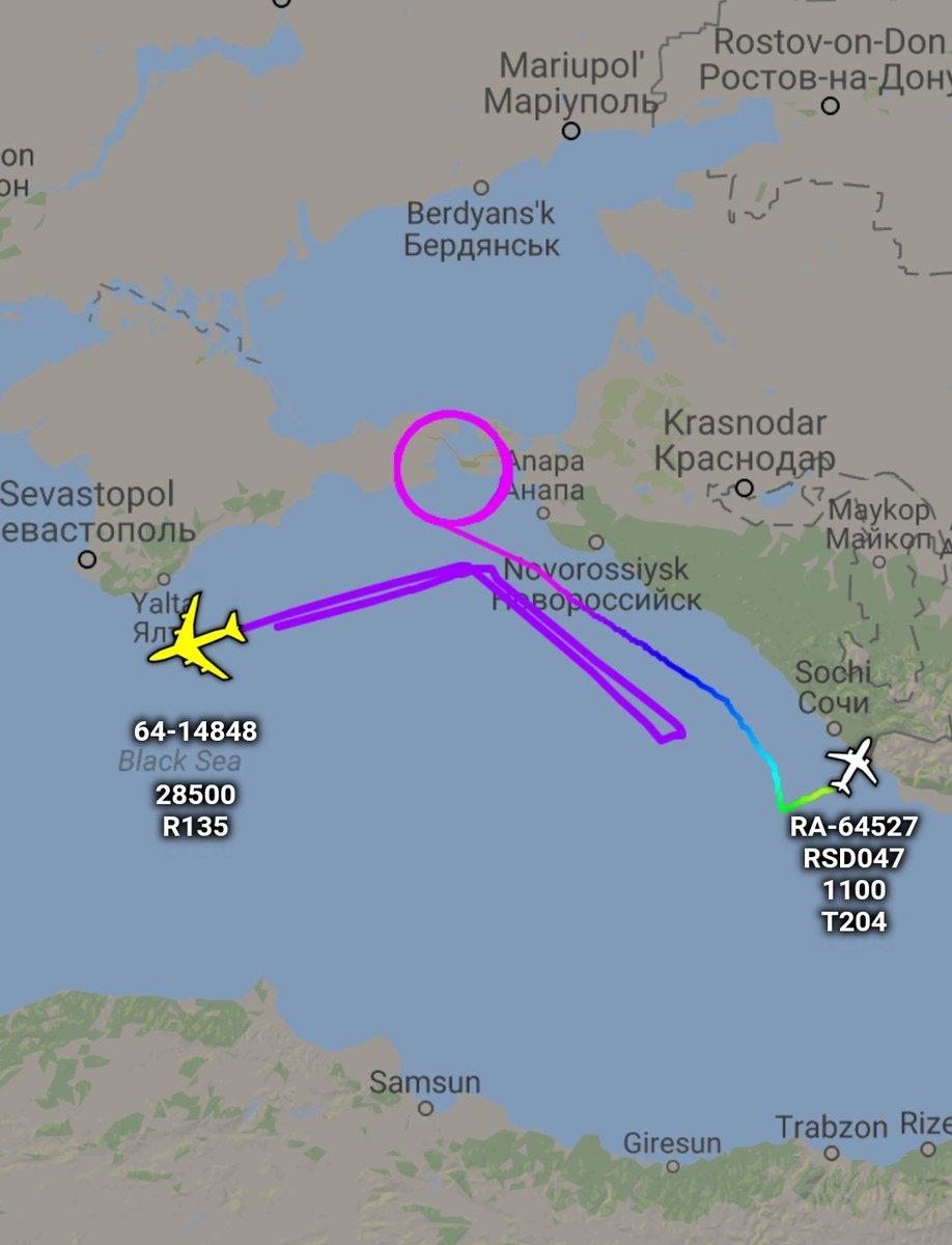 Ценциотти сообщил, что Ту-214СР начал кружить возле Крыма еще 1 августа, вылетев из Сочи. К слову, сегодня этот борт "нарезал круги" у Феодосии. В то же время, по словам журналиста, российский спецборт не был одинок во время своей миссии, пока кружил над Керченским полуостровом: каким-то образом он был перехвачен самолетом ВВС США RC-135V 64-14848, который взлетел с авиабазы Суда Бей на Крите, пролетел у Крыма, а затем направился к Новороссийску.