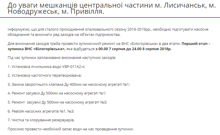 "Информируем, что для стабильного прохождения отопительного сезона 2018-2019 гг., необходимо подготовить насосное оборудование и выполнить ряд мероприятий на объектах предприятия. Для выполнения мероприятий необходимо провести остановочный ремонт на ВНС «Белогоровская» в два этапа. Первый этап - остановка ВНС «Белогоровская», которая состоится с 00.00 7 августа до 24.00 8 августа 2018 г.", - сообщается на сайте Лисичанскводоканала. Жителей центра Лисичанска, Новодружеска и Приволья просят произвести необходимый запас воды.
