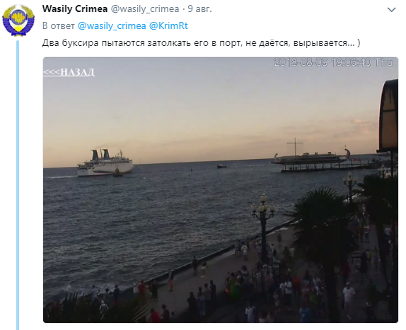 Российский круизный теплоход "Князь Владимир" сначала несколько часов не мог зайти в ялтинский порт, а затем и вовсе развернулся и поплыл обратно в Сочи.