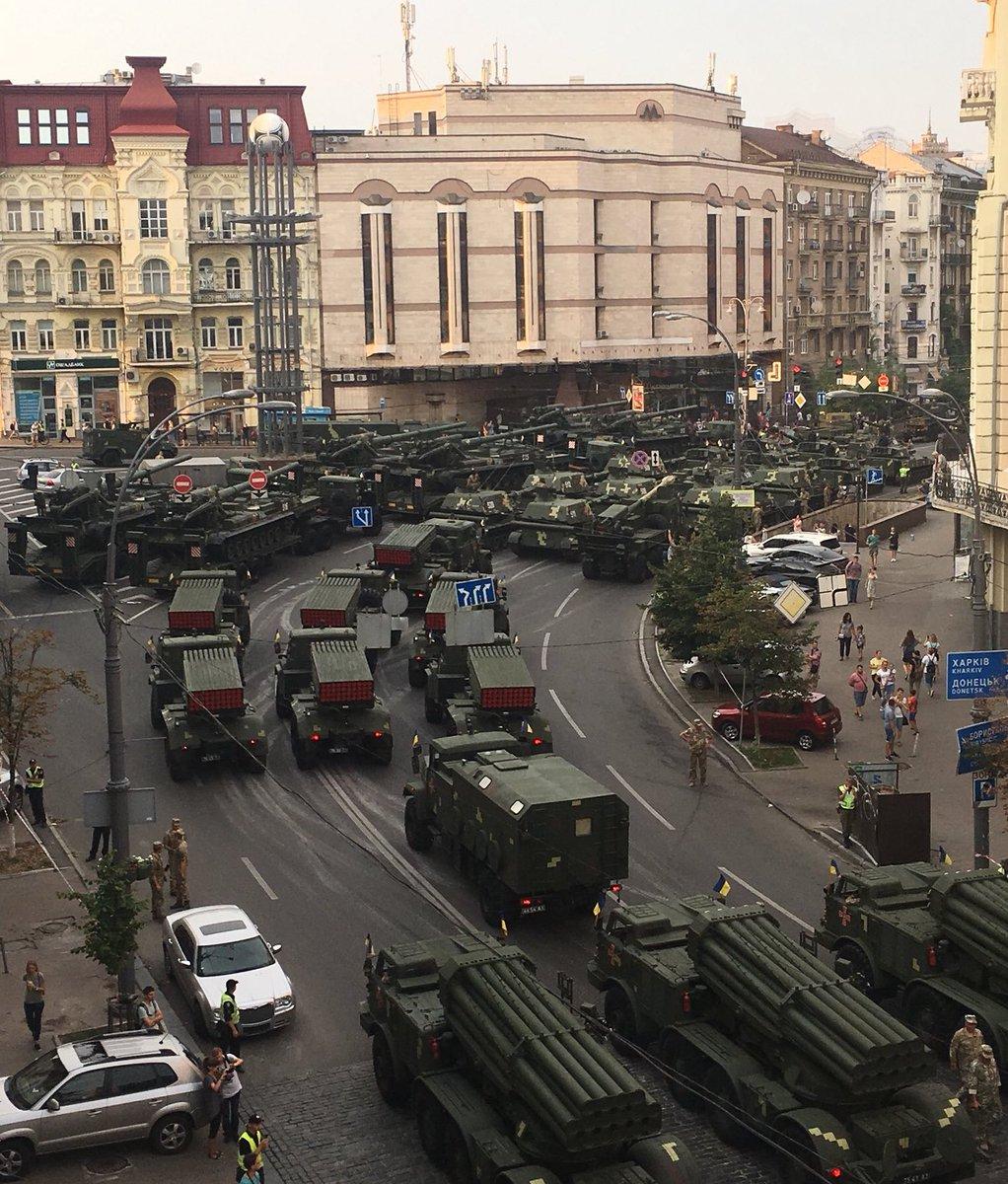 Накануне, вечером 18 августа, в Киеве прошла генеральная репетиция парада. Техники было так много, что она едва уместилась на дороге. Соответствующее фото опубликовали в соцсетях.