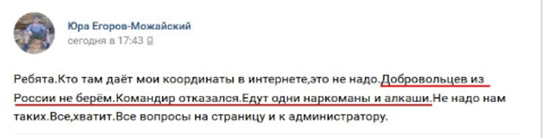 2Ребята, кто там дает мои координаты в Интернете, это не надо. Добровольцев из России не берем. Командир отказался. Едут одни наркоманы и алкаши. Не надо нам таких. Все, хватит, - пишет террорист.