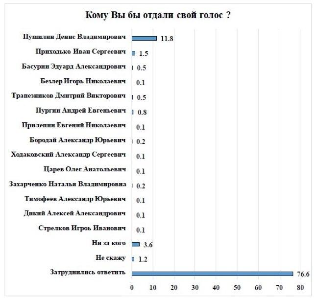 Но прикол в том, что, оказывается, пока (!) рейтинга НЕТ НИ У КОГО! Электоральное поле сейчас чисто: народ живет отдельно от политикума и без раскрученного Захарченко остается пока только Пушилин - у него высокая узнаваемость и он у власти. Про остальных успели просто забыть.