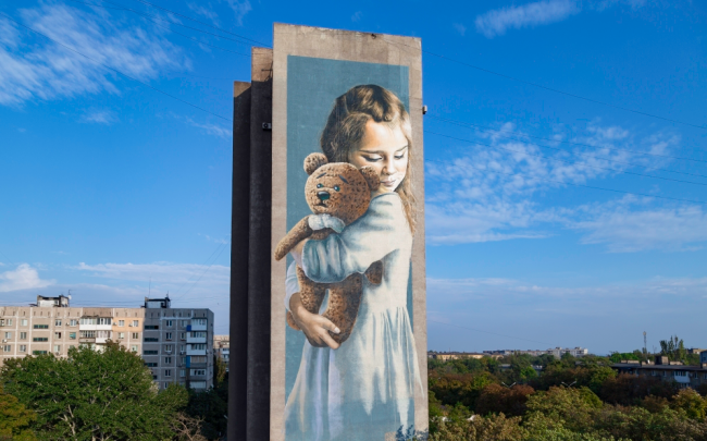 Стену одной из мариупольских высоток украсил мурал с девочкой, обнимающей плюшевого мишку. На рисунке изображена местная жительница Милана Абдурашитова: зимой 2015 года она с мамой попала под обстрели микрорайона Восточный.