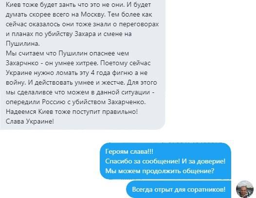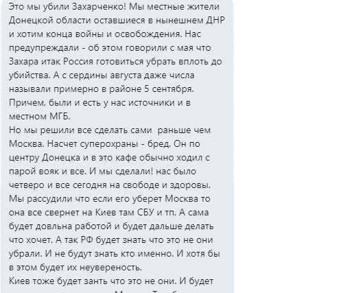 Отправители пишут, что они - жители оккупированной части Донецкой области - убили Захарченко, опередив в этом Москву. Якобы разговоры о том, что РФ планирует "убрать" главаря "ДНР", ходили с мая.