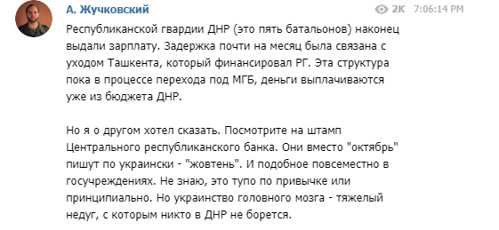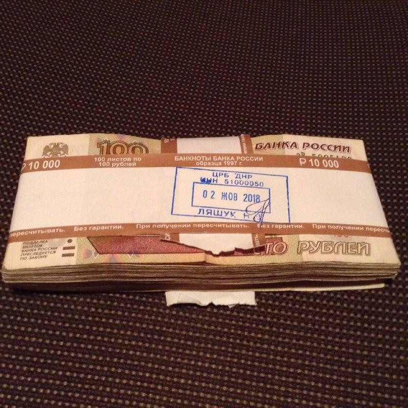 По его словам, зарплату "республиканской гвардии ДНР" выдали с месячной задержкой из-за ухода Ташкента, который эту структуру финансировал. При этом террорист выложил фото пачки российских рублей со штампом "ЦРБ", на котором по-украински написано "жовтень".