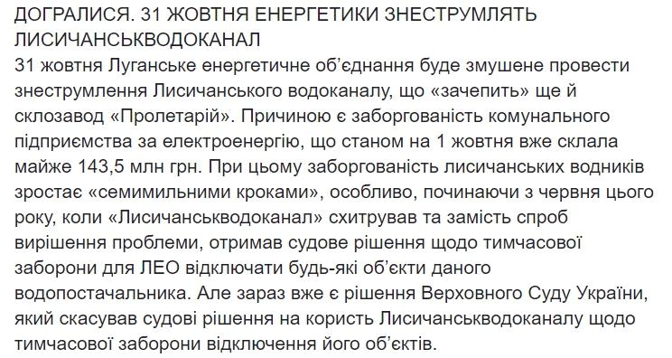 На странице в фейсбуке энергоснабжающего предприятия опубликован список наибольших должников с комментарием: «...из-за быстро растущего долга в размере более 143 млн грн. без воды останутся десятки тысяч людей на прифронтовой территории, полностью в населенных пунктах Приволье, Новодружеск, Малорязанцево и частично - в Лисичанске. В частности, в Лисичанске без воды окажутся район РТИ и часть города вместе со стекольным заводом «Пролетарий».