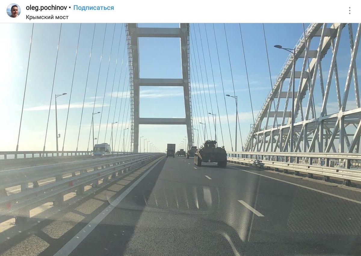 На незаконно построенном оккупантами мосту через Керченский пролив заметили колонну российской военной техники.