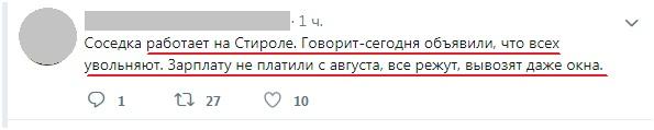 "Соседка работает на Стироле. Говорит - сегодня объявили, что всех увольняют. Зарплату не платили с августа, все режут, вывозят даже окна", - пишут пользователи соцсетей.