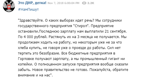 "Здравствуйте. О каких выборах идет речь? Мы сотрудники государственного предприятия "Стирол". Предприятие остановили. Последнюю зарплату нам выплатили 21 сентября. По 4 000 рублей. Растянуть их на 3 месяца не получается. Мы продолжаем ходить на работу, но некоторым уже не за что хлеба купить, не говоря уже о проезде до работы. Сил нет терпеть это безобразие. Все бюджетные предприятия в Горловке получают зарплату, а мы промышленный гигант ни копейки. О полноценном запуске предприятия вообще сказали забыть. Новое правительство не готово. Пожалуйста, обратите внимание и на нас".