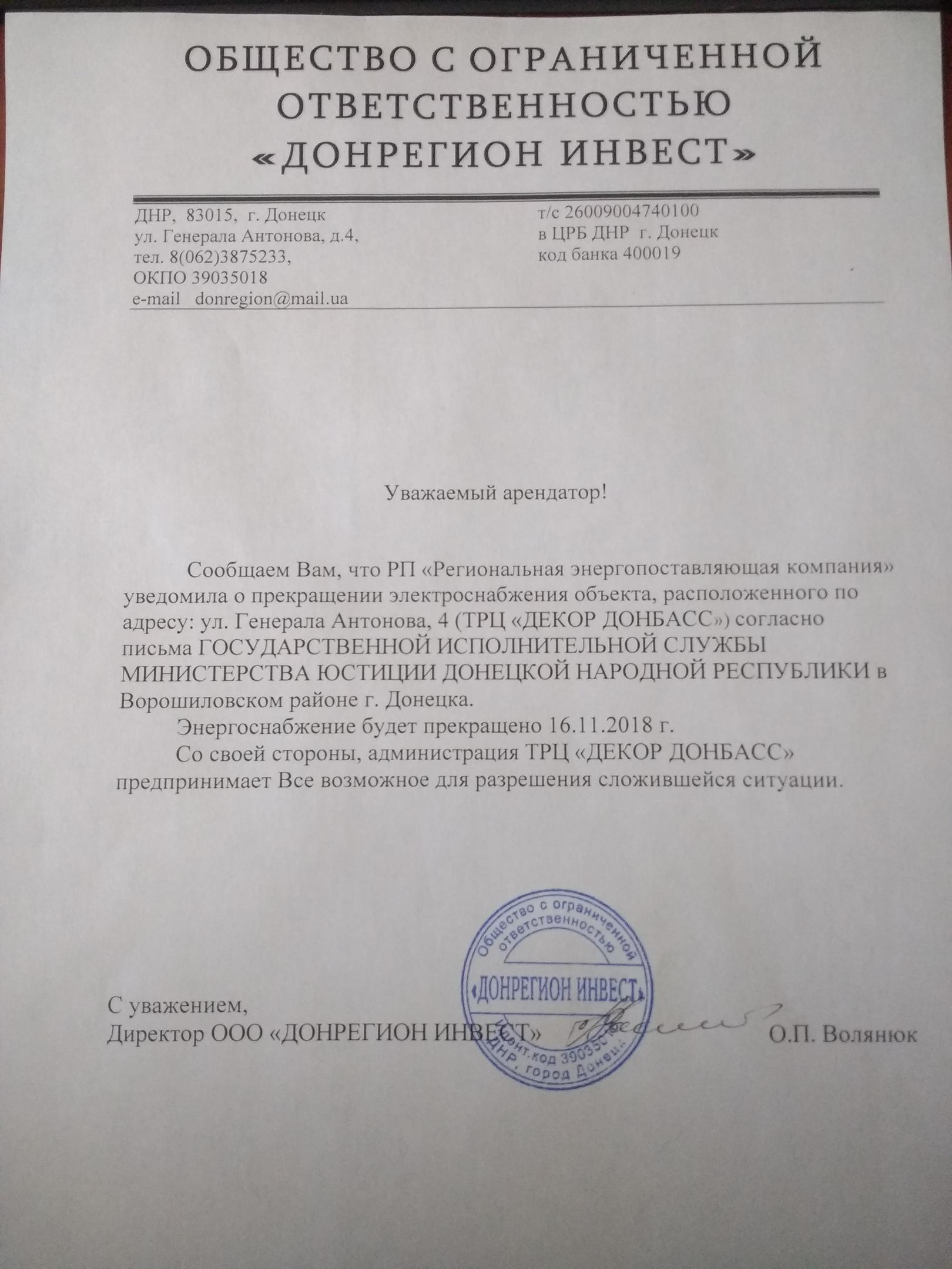 В сети обнародованы копии "документов", в которых хозяева ТРЦ - ООО "Донрегион Инвест" - предупреждают арендаторов о прекращении электроснабжения с 16 ноября.