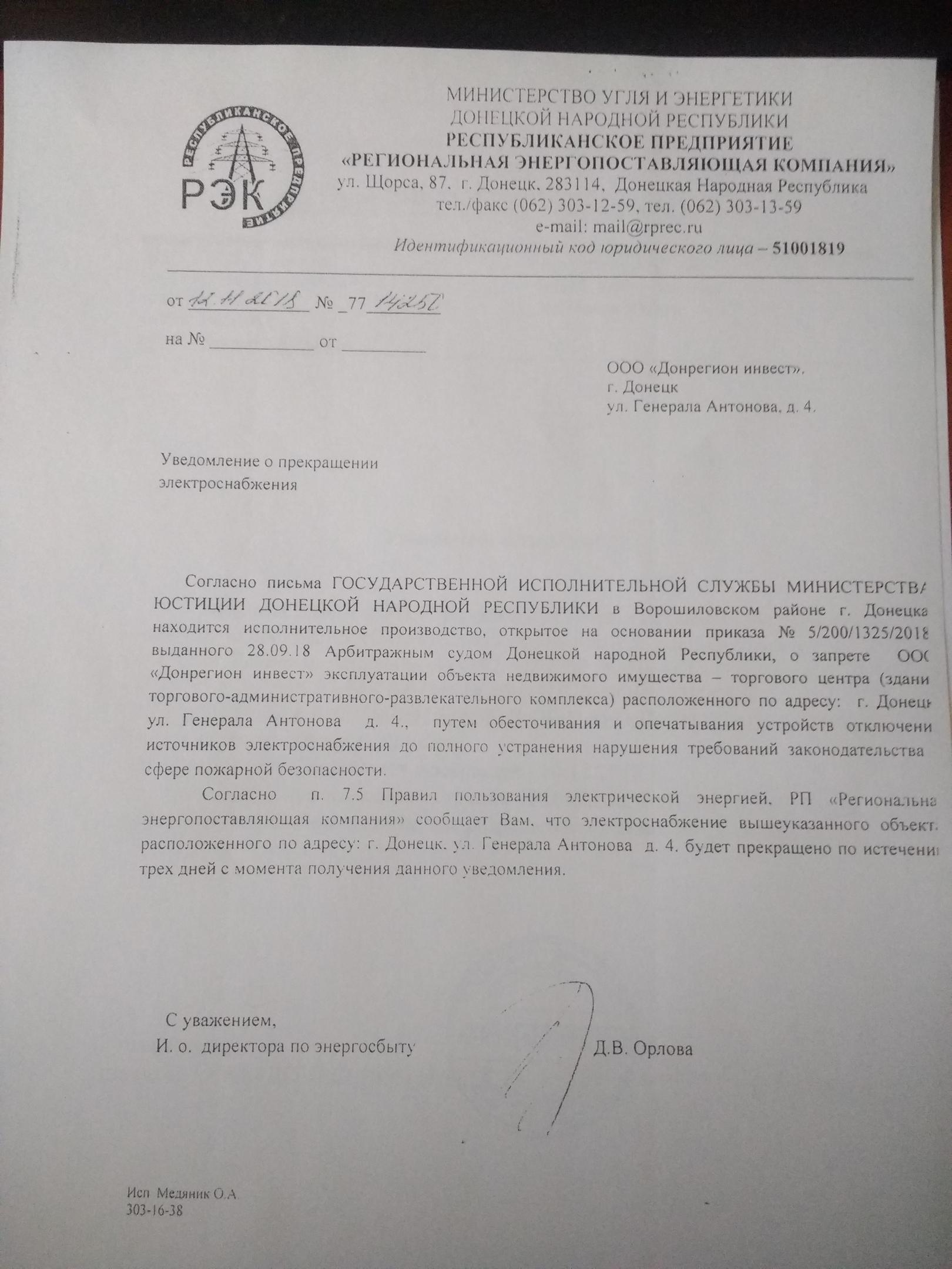 Из другого "документа" от предприятия "Региональная энергопоставляющая компания" следует, что ТРЦ обесточено якобы из-за нарушений норм пожарной безопасности. Отмечается, что "Донрегион Инвесту" запрещено эксплуатировать здание торгового центра до полного устранения нарушений.