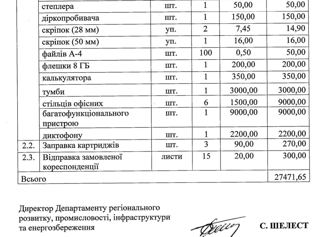 21 ноября глава Луганской областной государственной администрации подписал распоряжение о затратах на подготовку к проведению конкурса по перевозке пассажиров на пригородных и междугородных маршрутах общего пользования, которые не выходят за пределы области. Согласно смете, потратить на это мероприятие надо 27 471,65 грн. В ней скурпулезно подсчитали скрепки, бумагу, конверты и прочую канцелярию. Но к этим понятными расходным материалам добавили приобретение дырокола, калькулятора, тумбы за 3000 грн., стульев офисных по 1500 грн, МФУ за 9000 грн (видимо, с фотопечатью?), диктофона за 2200 грн.