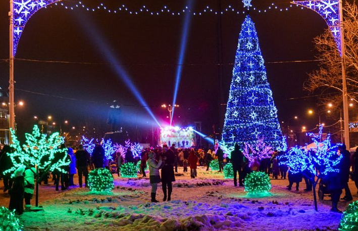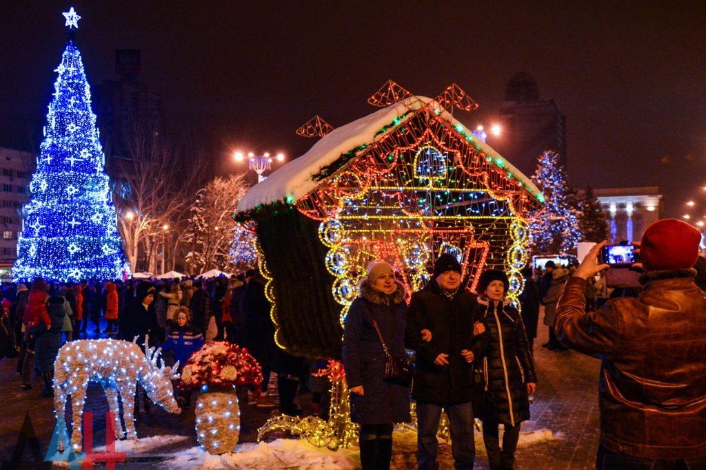 Массовое гуляние проводилось на площади Ленина в центре Донецка. Горожанам продемонстрировали шоу-программу, приуроченную к Новому году.
