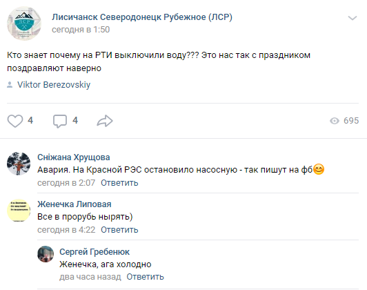 "Просидели на днях сутки без света (р-н РТИ 1 микро). Сейчас сидим без воды. Я так понимаю, проходим квест "Остаться в живых"?" - написал один из пользователей Фейсбука.