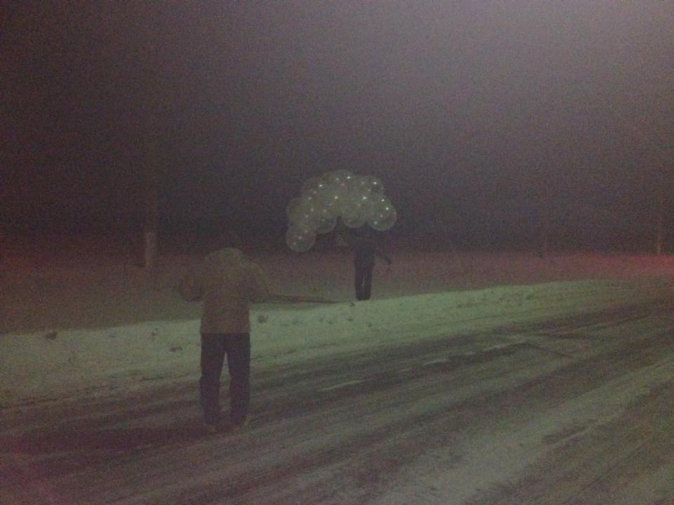 "Сегодня, 22 января, неравнодушные украинцы в лице военных, проходящих службу на передовой Донбасса поздравили жителей города (и боевиков) с Днем Соборности. На воздушных шариках в Донецк полетели тысячи поздравительных открыток с изображением сине-желтой Украины. Траекторию передвижения открыток и места их падения зафиксировал специальный трекер. Большая часть шариков приземлилась на проспекте Богдана Хмельницкого.