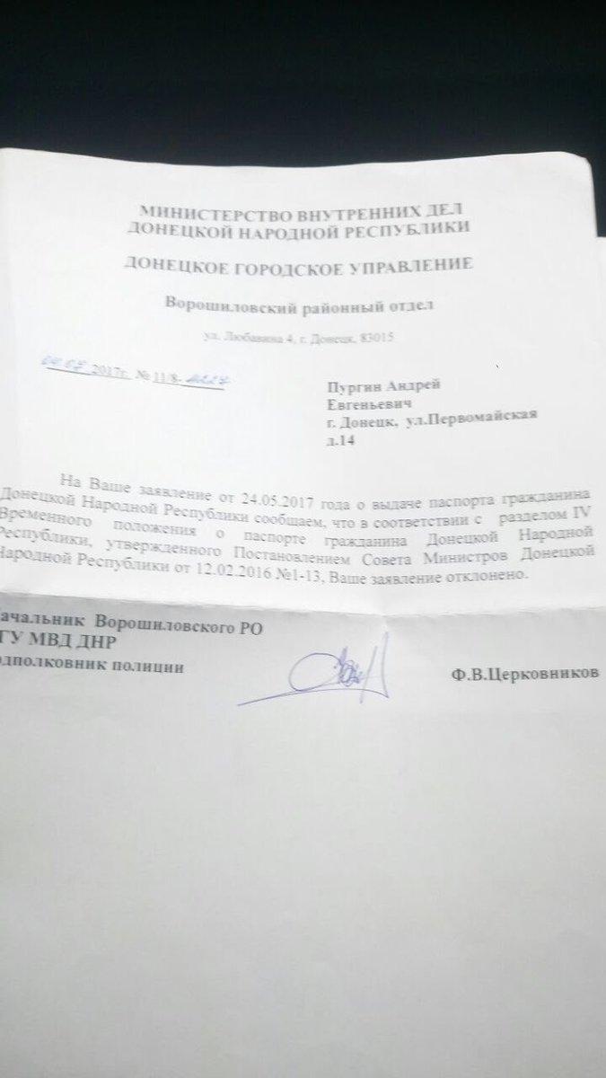 Андрею Пургину, который в свое время и придумал ДНР, отказали в выдаче паспорта "гражданина ДНР". Ахахаха, это анекдот года.