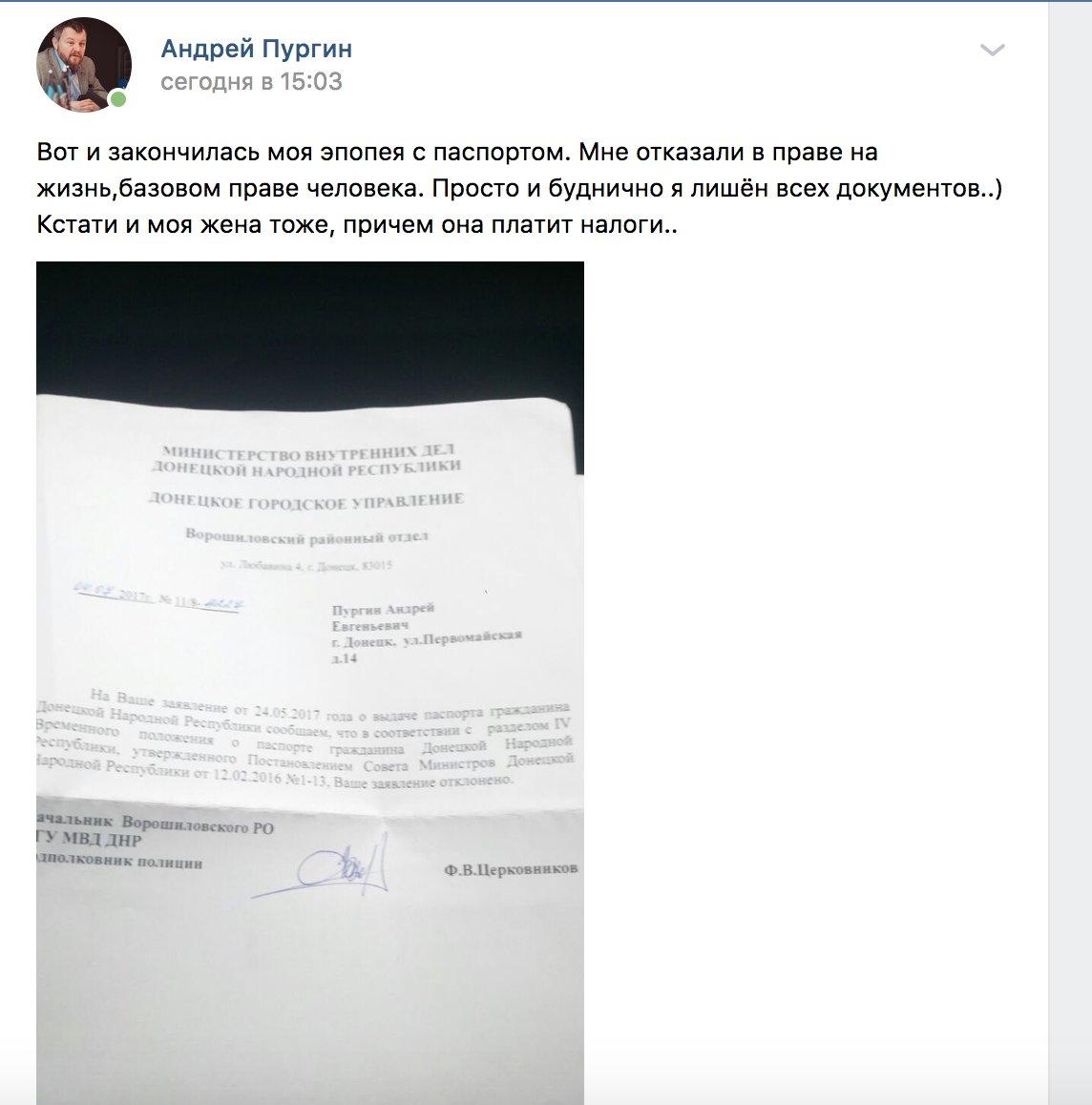 "Андрею Пургину, который в свое время и придумал ДНР, отказали в выдаче паспорта "гражданина ДНР". Ахахаха, это анекдот года. "Мне отказали в праве на жизнь" - пишет Пургин. Чувак, да из-за тебя миллионы людей лишились права на нормальную жизнь", - пишет Казанский.