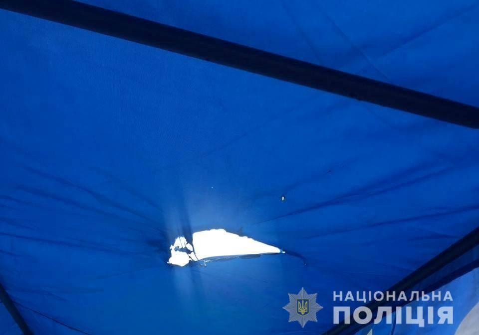 Полиция установила, что неизвестные бросили горящую газету на агитационную палатку, расположенную в районе Центрального рынка г. Лисичанска. В результате "нападения" образовалось небольшое отверстие на крыше палатки.