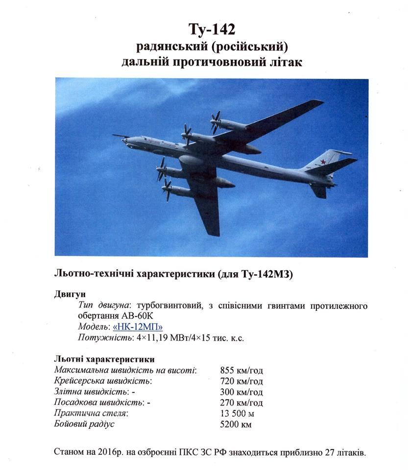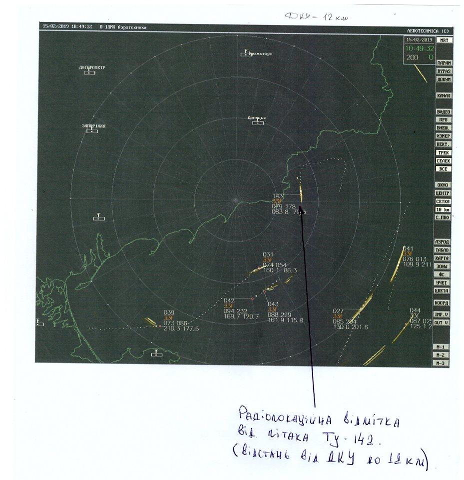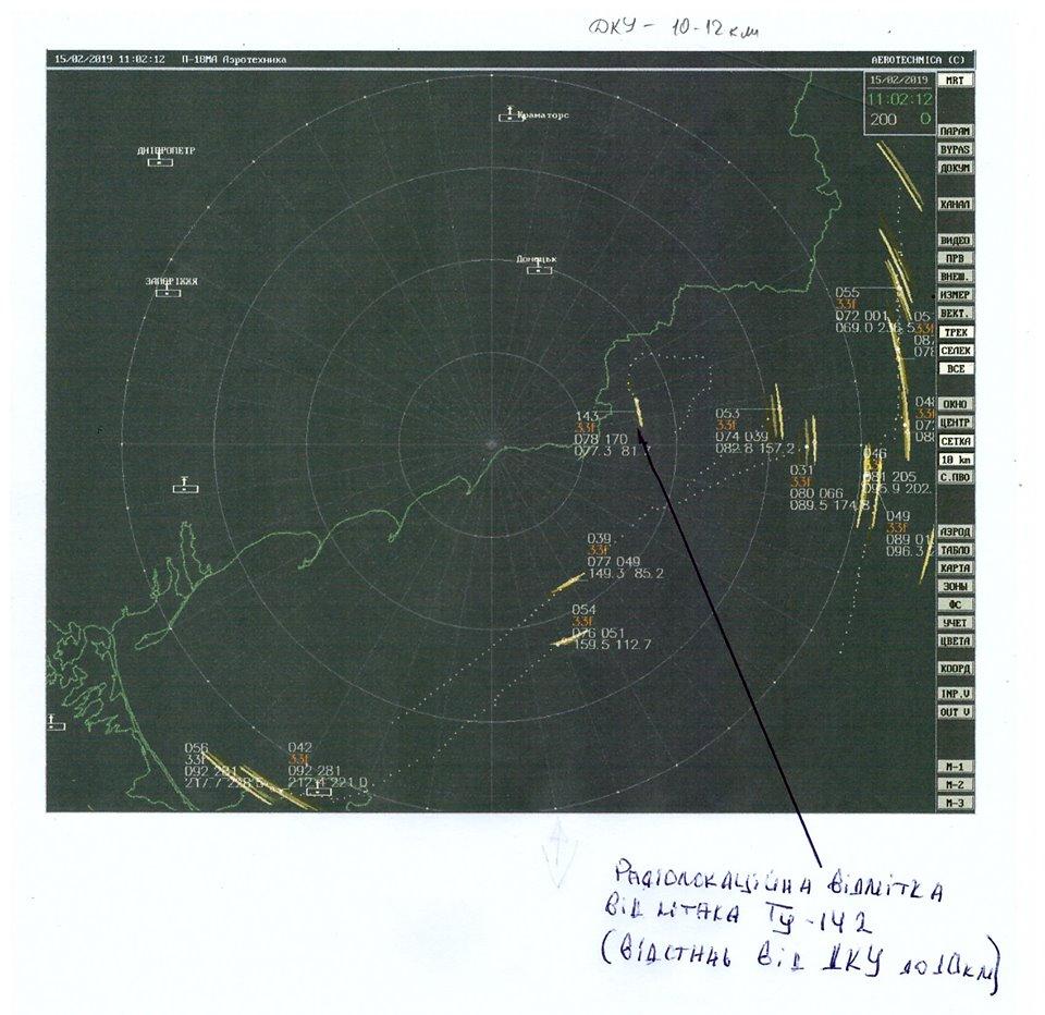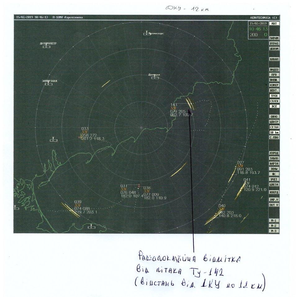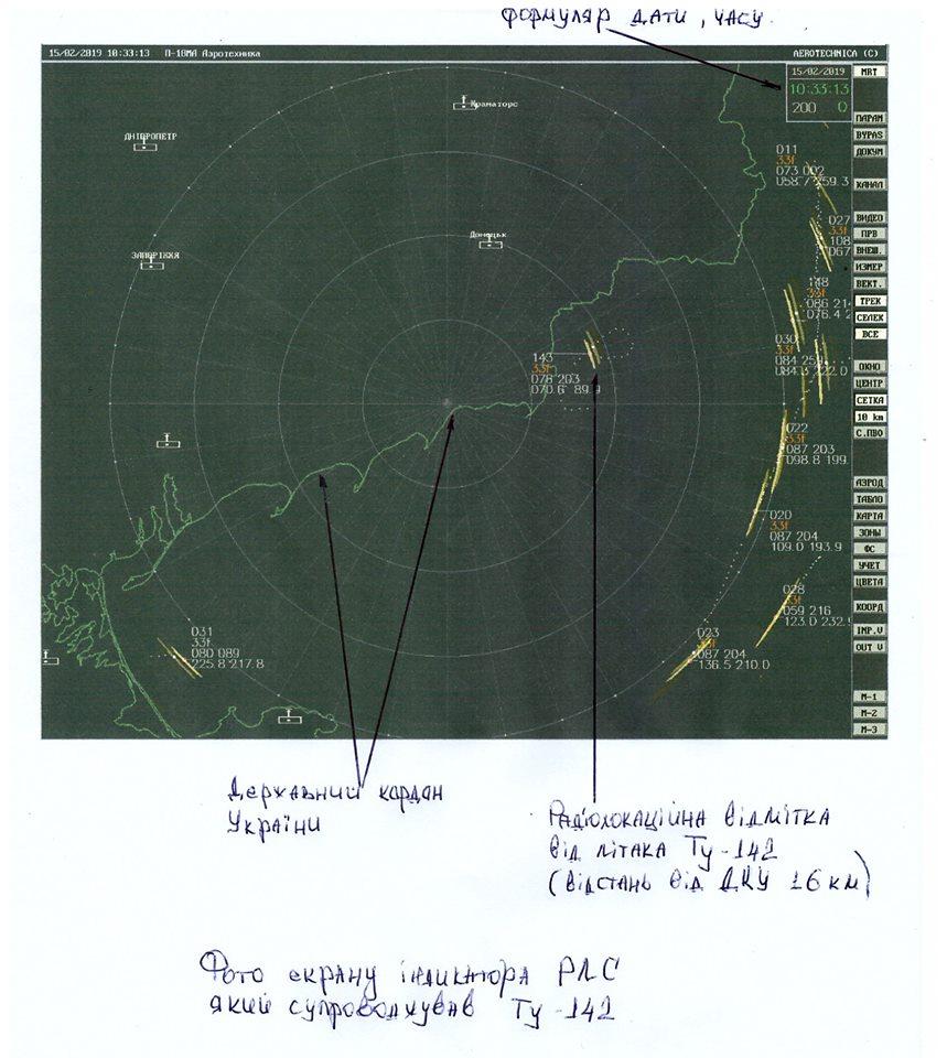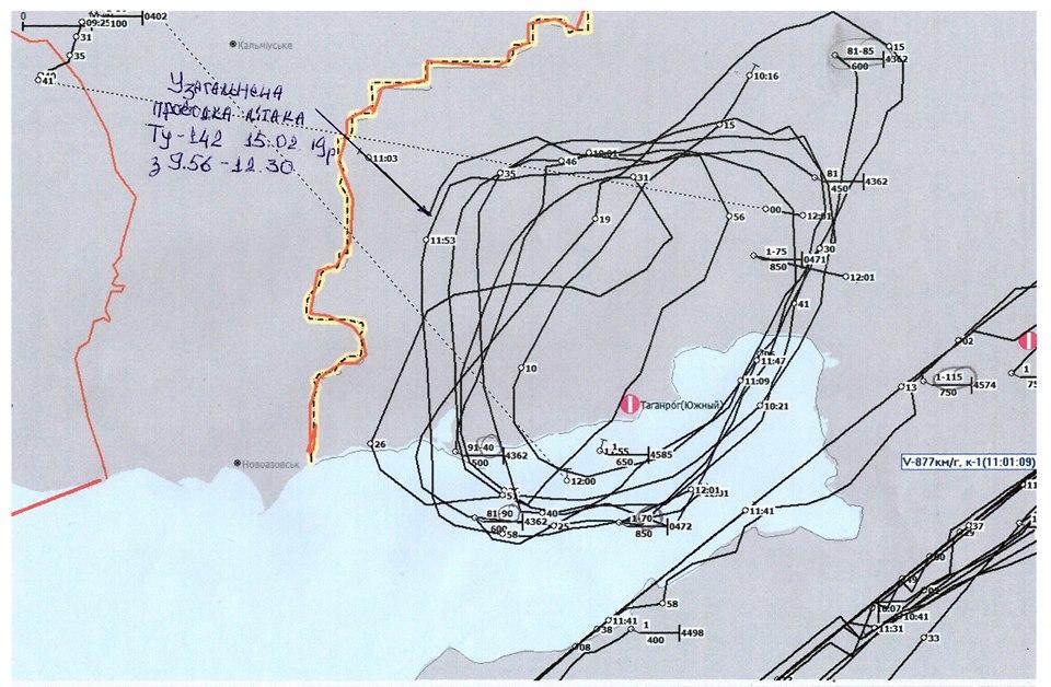 "15 февраля 2019 года дежурными подразделениями радиотехнических войск Объединенных сил в 9.56 в районе аэропорта Таганрог была обнаружена воздушная цель, идентифицированная как дальний противолодочный самолет Ту-142 вооруженных сил Российской Федерации. Определенный самолет совершал тестовый полет вокруг аэродрома Таганрог с приближением к государственной границе Украины на расстояние до 10 км. На протяжении всего маршрута самолет сопровождался радиолокационными станциями радиотехнических войск Объединенных сил. Самолет Ту-142 ВС РФ оставил зону, приближенную к государственной границе Украины, в 12.30 в районе аэродрома Таганрог. Указанный самолет государственную границу Украины не пересекал и в воздушное пространство Украины не входил.