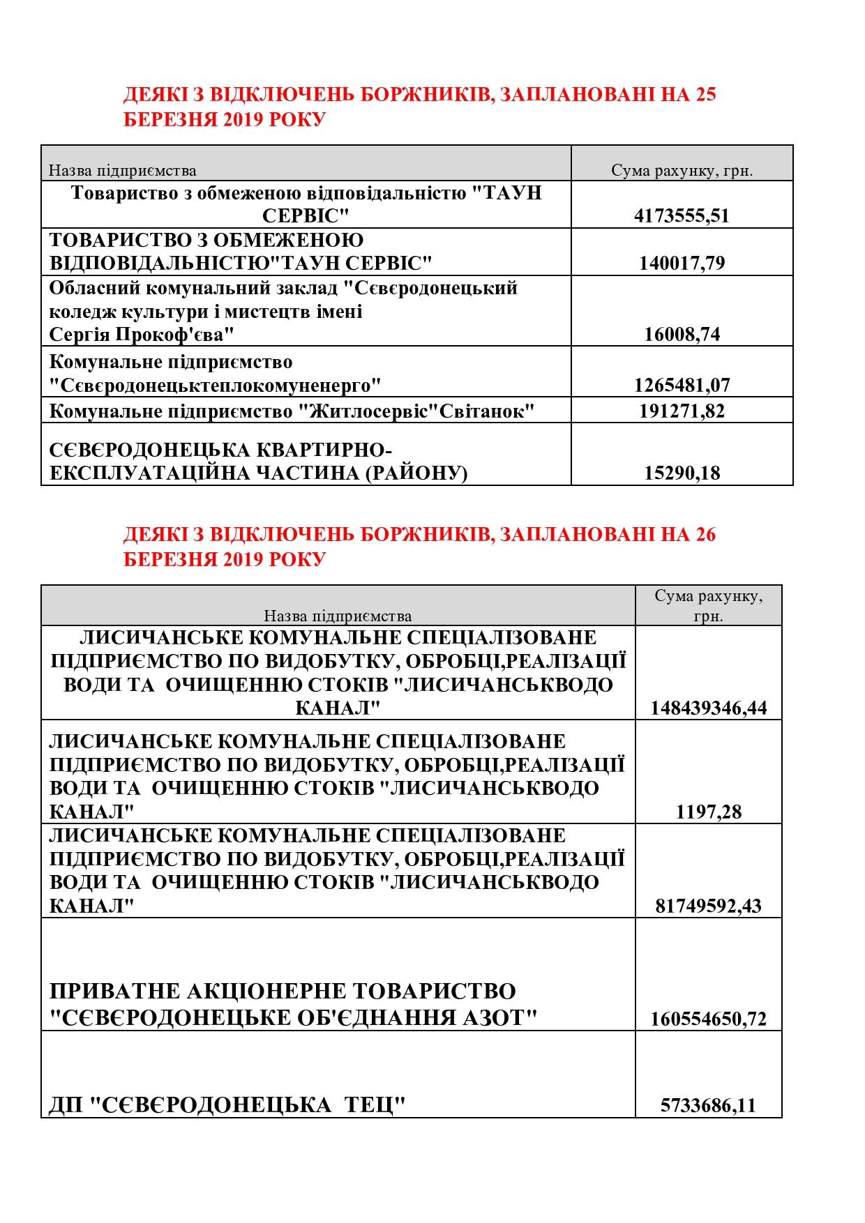 ООО "Луганское энергетическое объединение" анонсировало список предприятий-должников, которые подлежат отключению 26 марта 2019 года. Возглавило данный список коммунальное предприятие "Лисичанскводоканал".