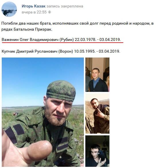 Так, 3 апреля был ликвидирован Важенин Олег с позывным "Рубин" из Казани, воевавший в террористическом батальоне "Призрак".